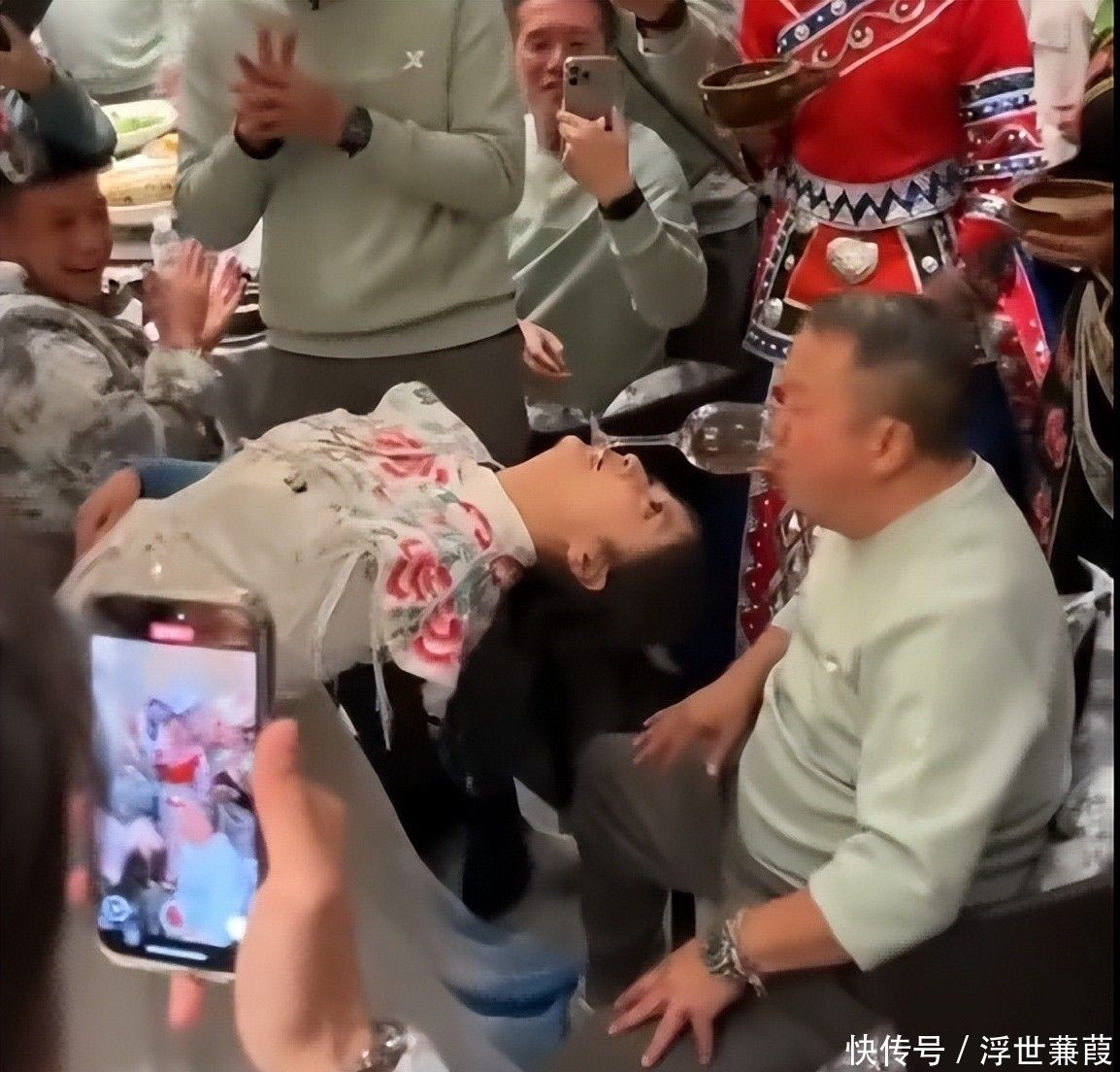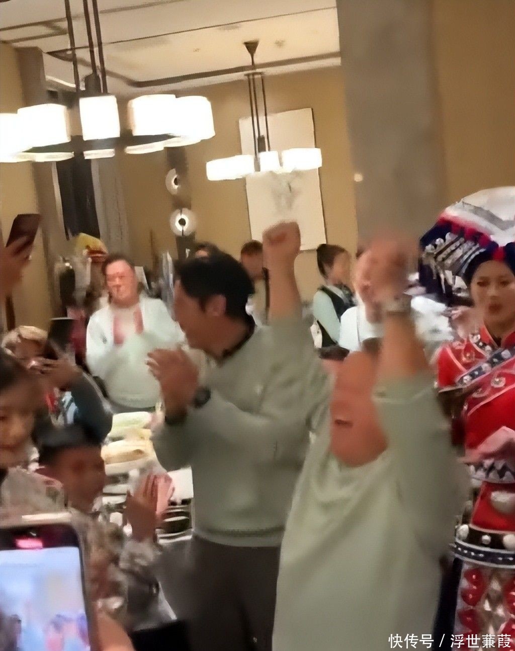 15. 周围艺人纷纷鼓掌起哄,现场气氛热烈,更有身着少数民族服装的女子列席两侧,构成一幅复杂而微妙的画面。